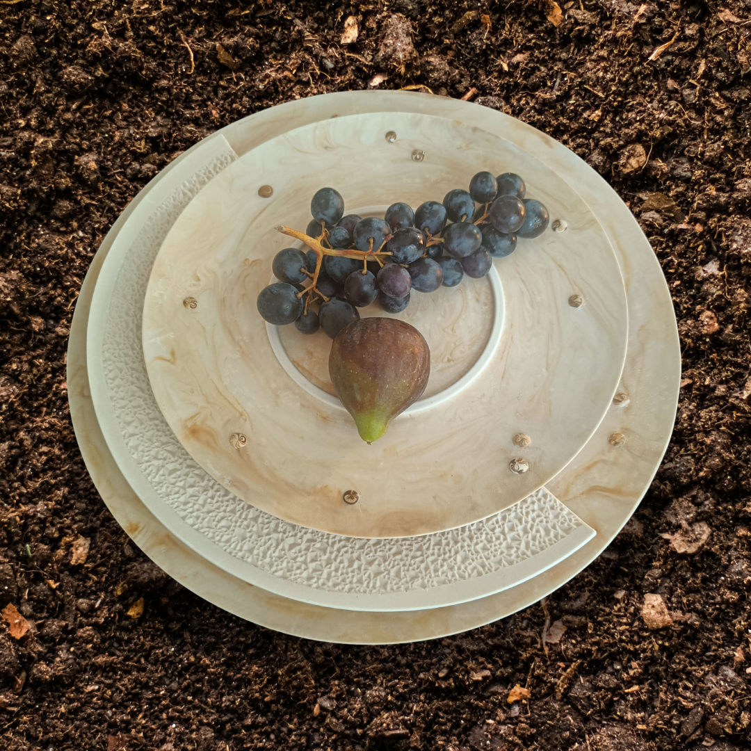 - A detachable, dishwasher-safe porcelain plate nested within a handcrafted eco-resin underplate