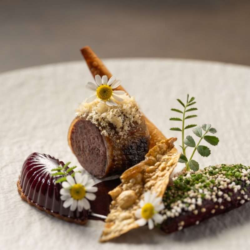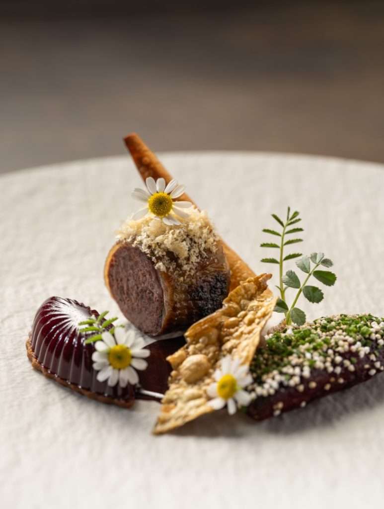 The glaze is where Tordai’s creativity shines: a rich reduction of dashi, soy, honey, and smoked trout that paints the rooster in a glossy, umami-rich coat . The garnishes provide essential balance: a slow-roasted red cabbage glazed with red wine and raisins, a bright beetroot-raspberry jelly on a crisp sea buckthorn tart, and a comforting roasted parsnip and apple purée . It is a dish that is deeply traditional yet surprisingly modern, capturing the wild spirit of the region.