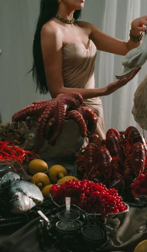 Designed by architect Will Erens of Too Many Agencies, the interior of The Siren reflects the diversity and beauty of the Mediterranean. Marble and copper details create a kaleidoscopic effect, while a stunning statue of a siren oversees the space, enhancing the restaurant’s enchanting atmosphere.
