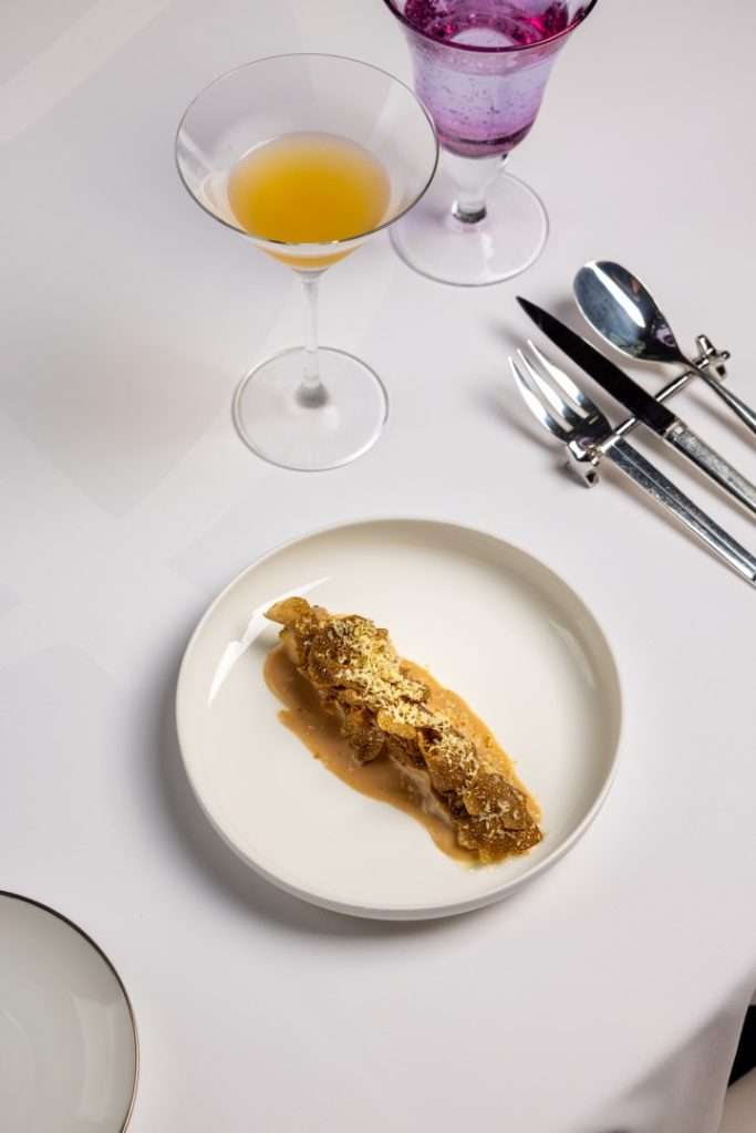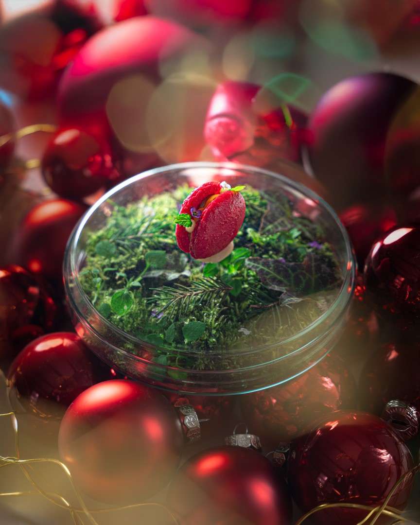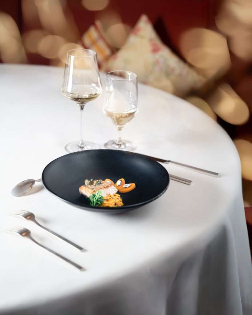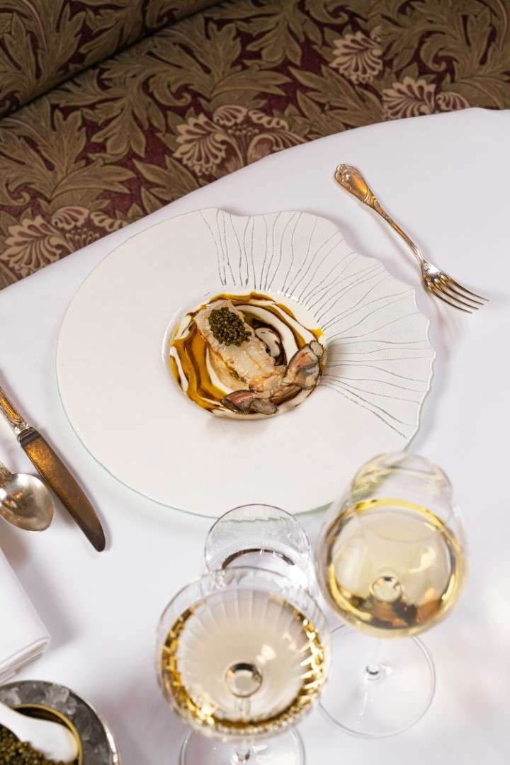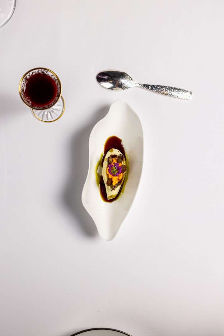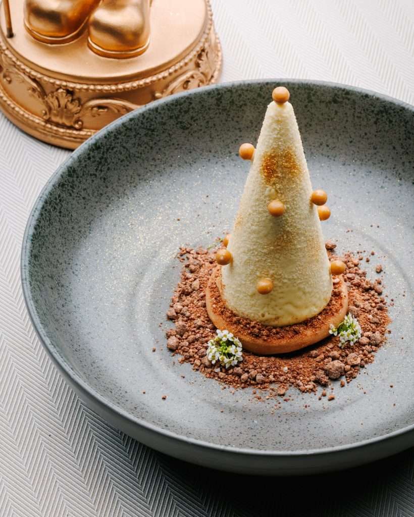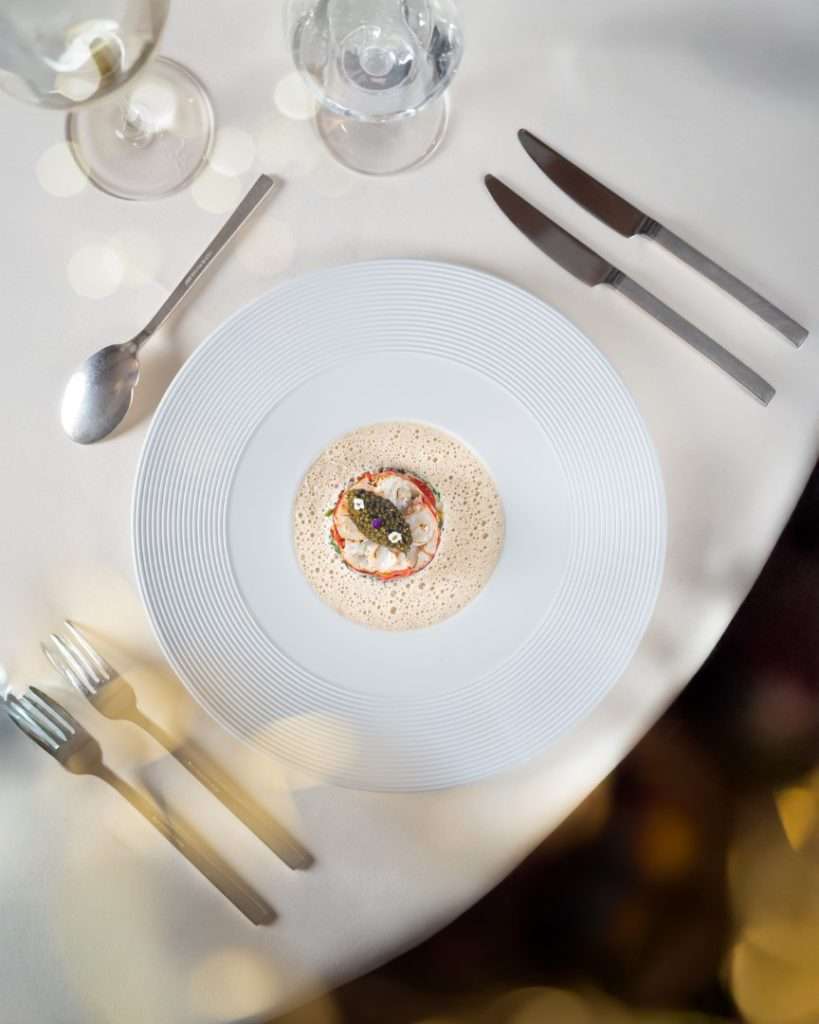 Chef Bourny’s festive menus are a study in daring elegance. The experience opens with the freshness of Langoustine and Caviar, lifted by a smoked raw cream and bergamot—a signature interplay of sea and citrus.
