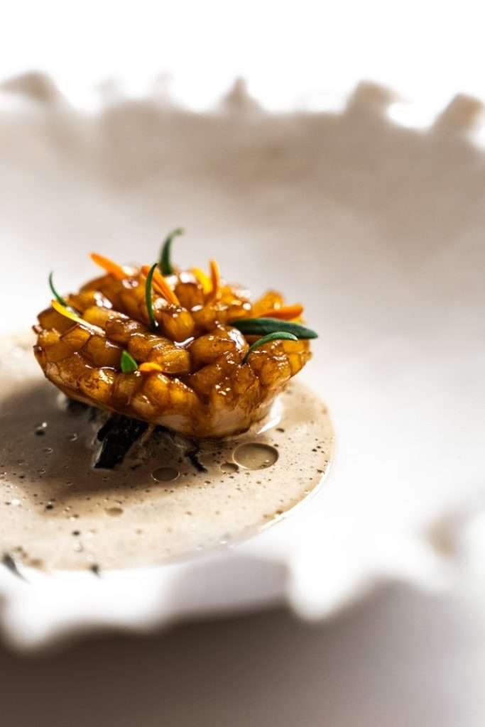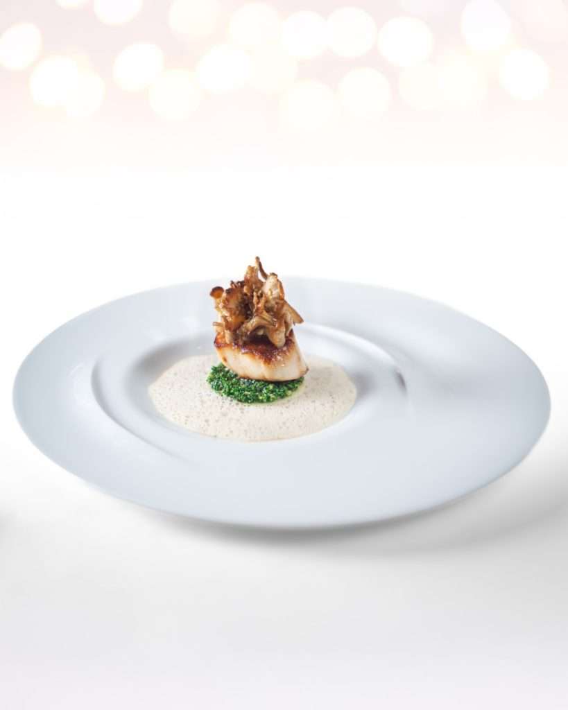 First Course: Scallop with mushrooms and Mélanosporum truffle — Intense plantain and black garlic sauce