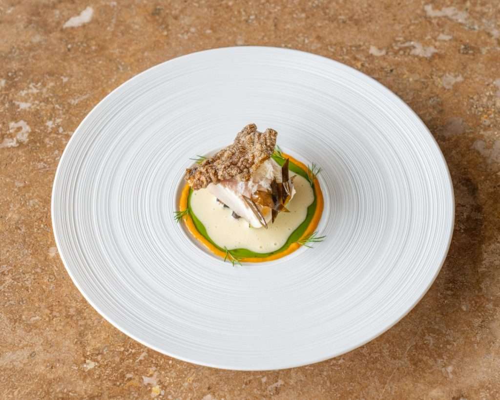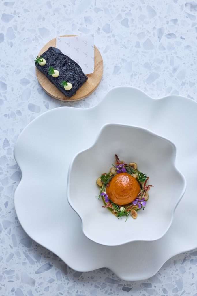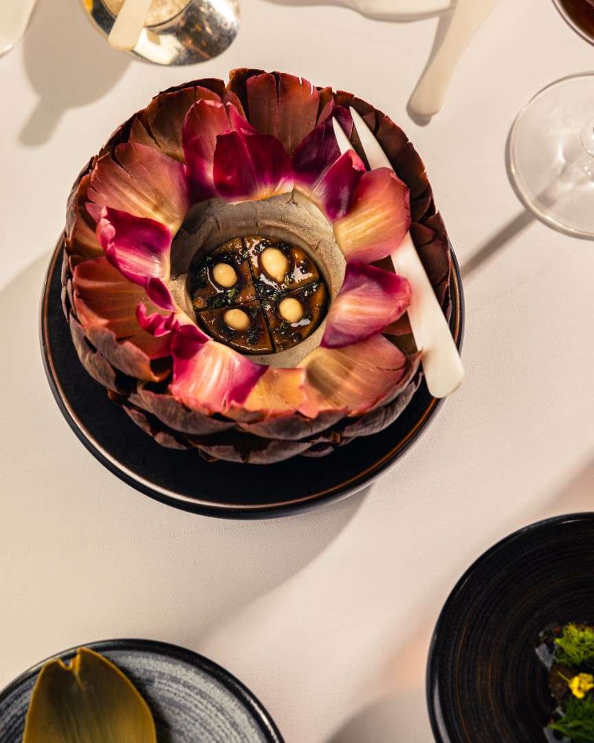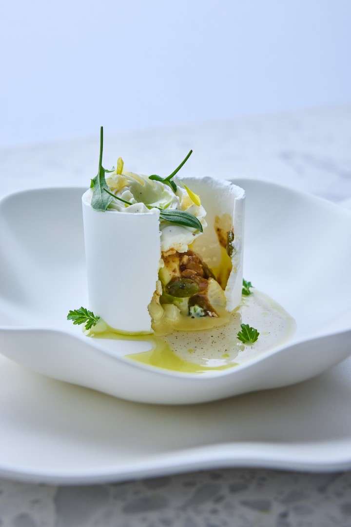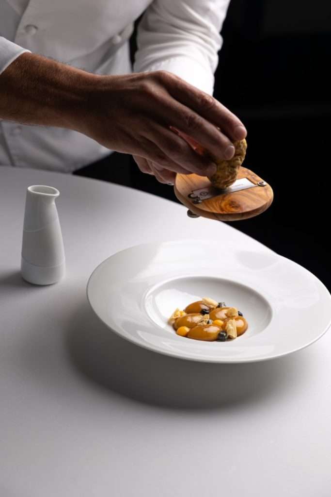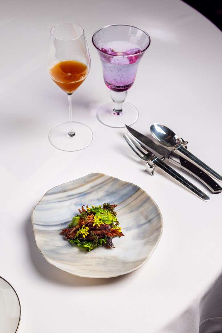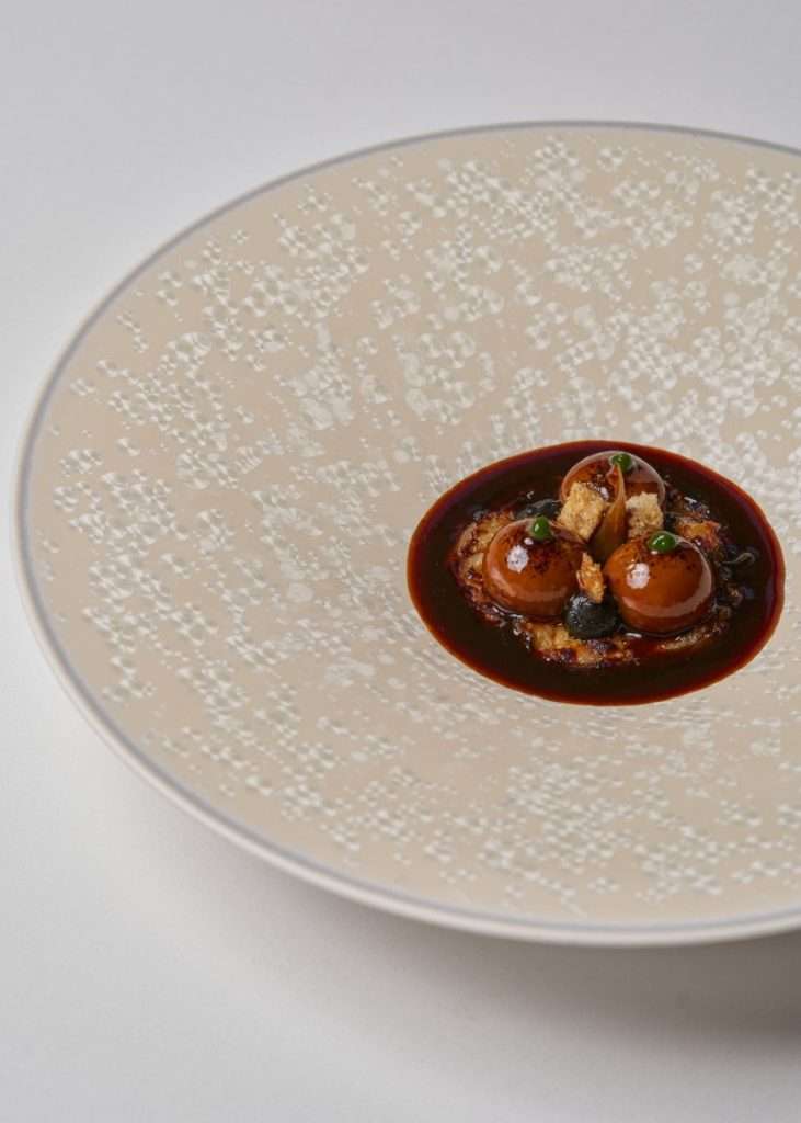 The centerpiece of this collection is the Wild Turbot, a dish Chef Rosso describes as a study in “monochromatic woody tones.” Gently smoked to evoke the scent of a chimney, it is dressed in walnut miso and cut with vintage pine shoot vinegar.