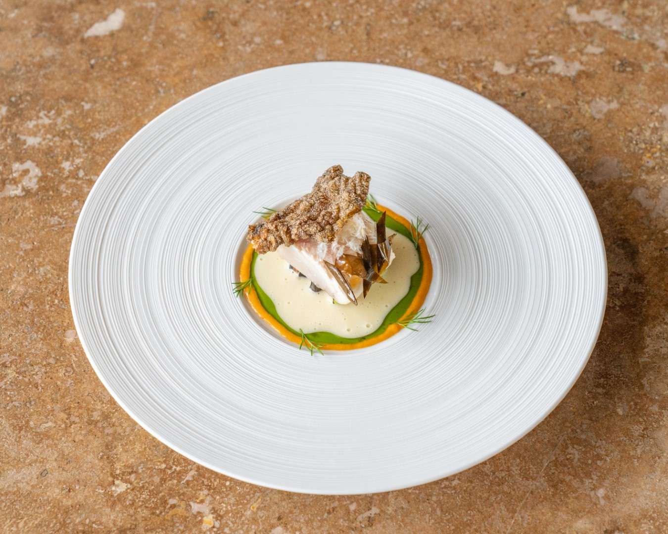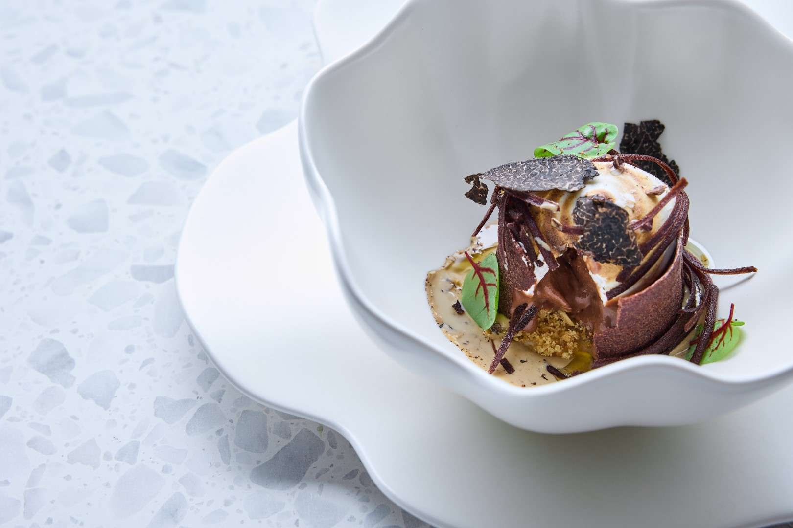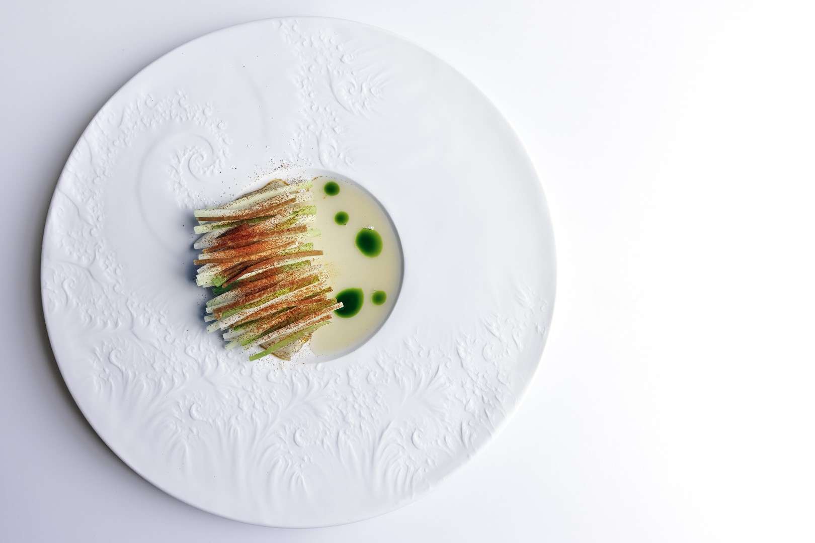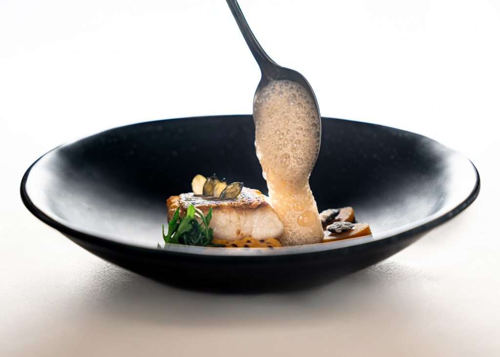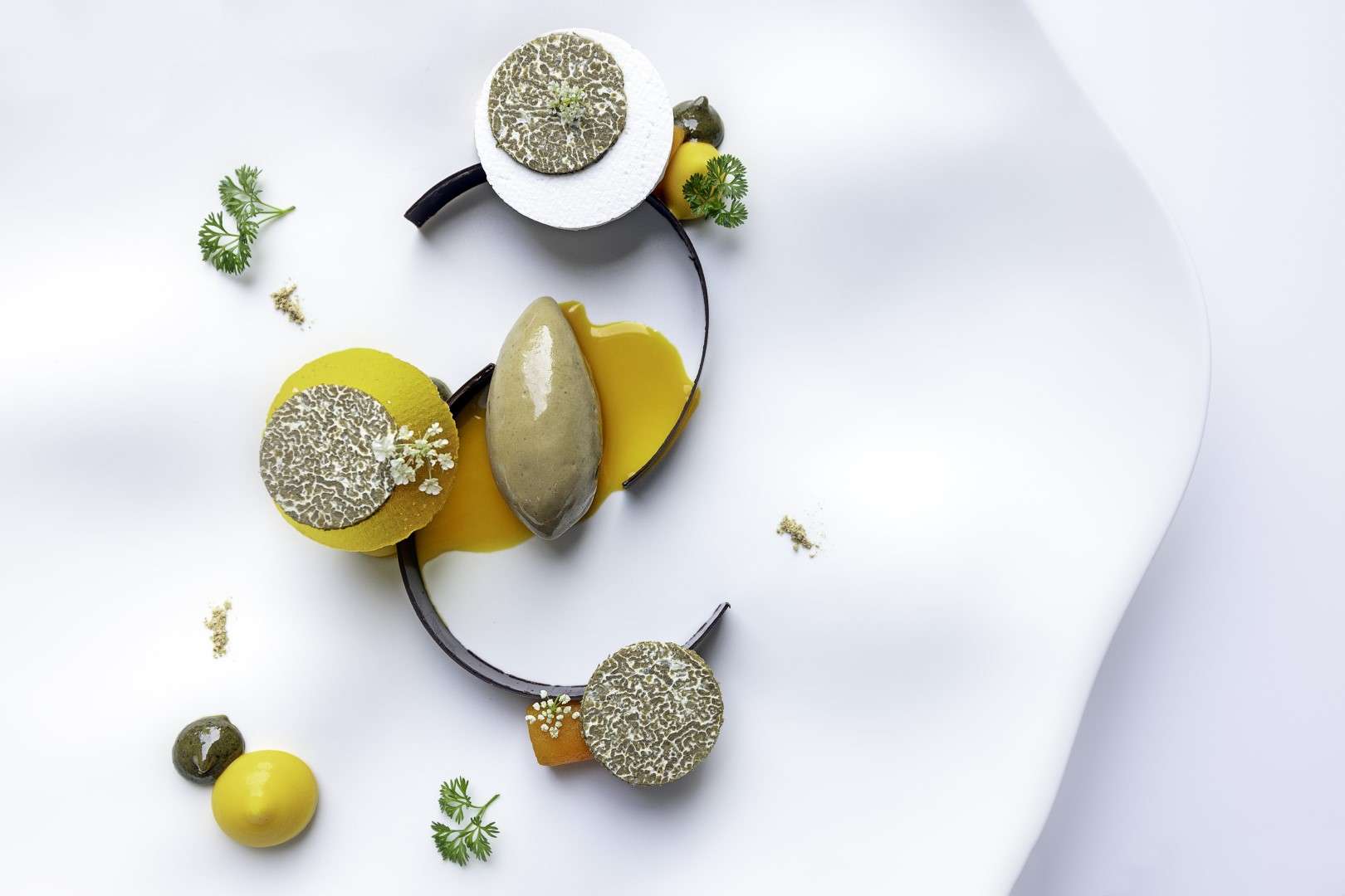 The centerpiece of this collection is the Wild Turbot, a dish Chef Rosso describes as a study in “monochromatic woody tones.” Gently smoked to evoke the scent of a chimney, it is dressed in walnut miso and cut with vintage pine shoot vinegar.