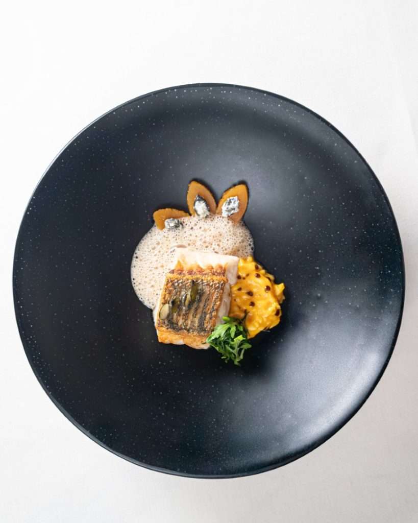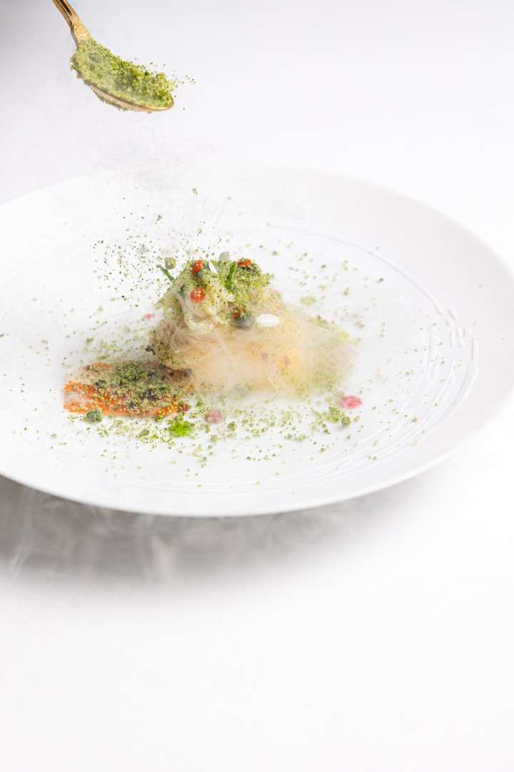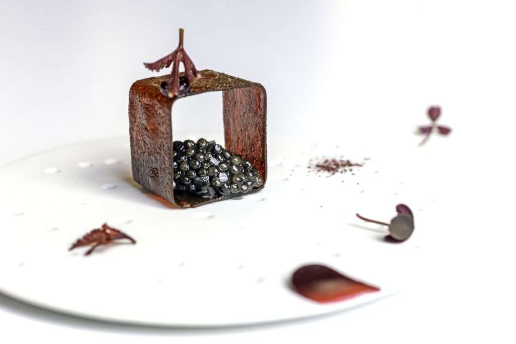 The Terroir of Imagination This is a love letter to the land that rests beneath the winter mist. The journey begins with a local treasure—Italian Caviar from Calvisano—paired with the earthiness of beetroot chips, bridging the gap between luxury and the sleeping garden. The vision flows into the freshness of the sea, with shellfish and seabass paired with organic vegetables that Baiocco famously cultivates himself.