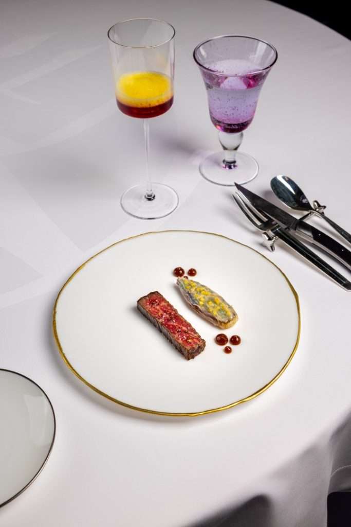 Meat Course: Delicately poached A5 Wagyu beef — Aquitaine caviar