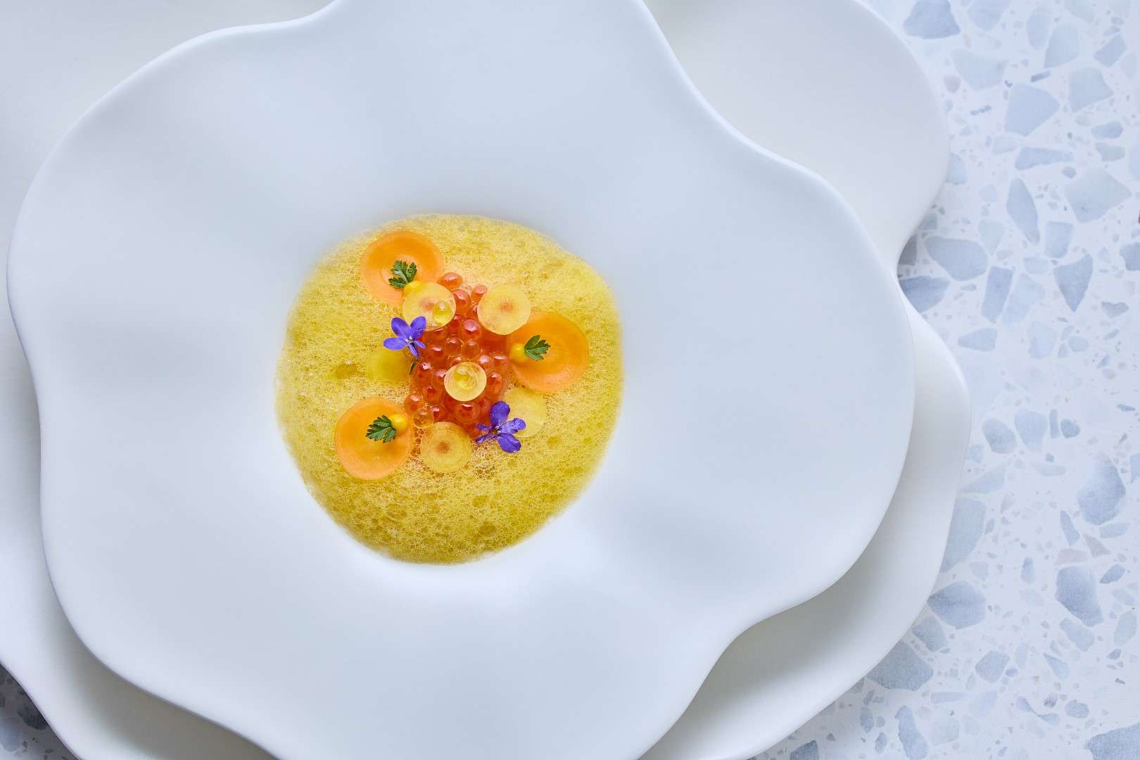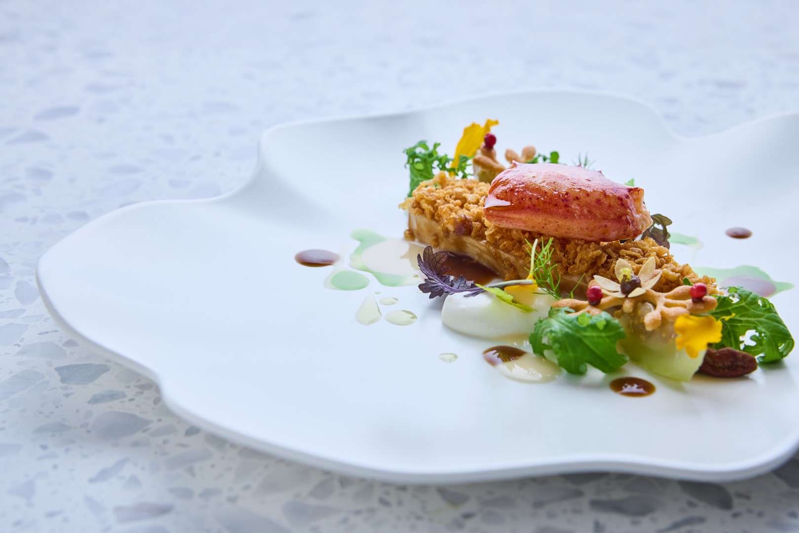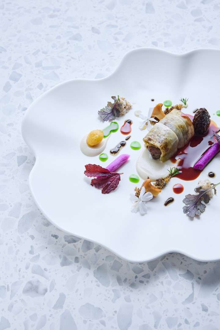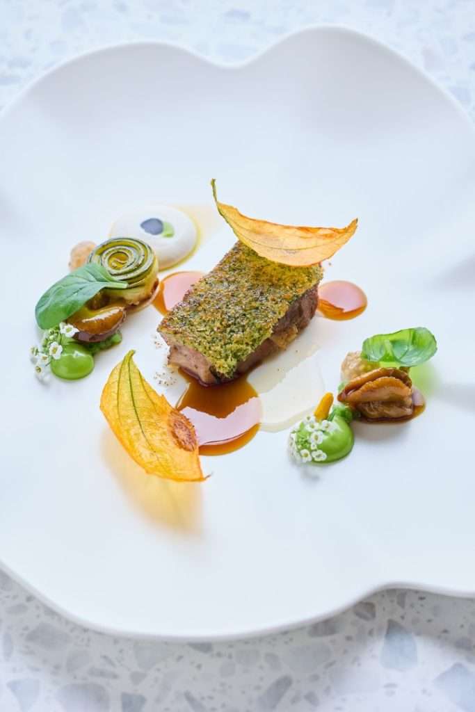 The Technical Pillar: Huang showcases his French mastery through the Petit Pois A La Francaise, a delicate construction of Matsuba crab and teardrop peas, and the Vichy, a vibrant dish of New Zealand King Salmon infused with lavender.