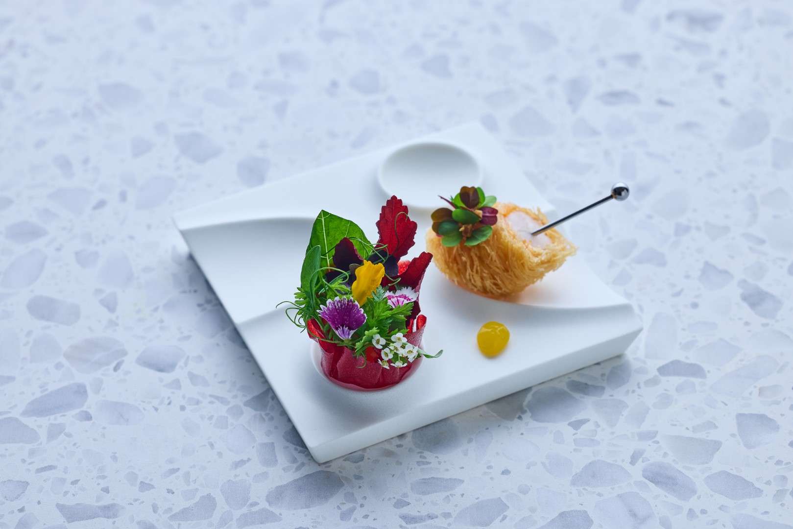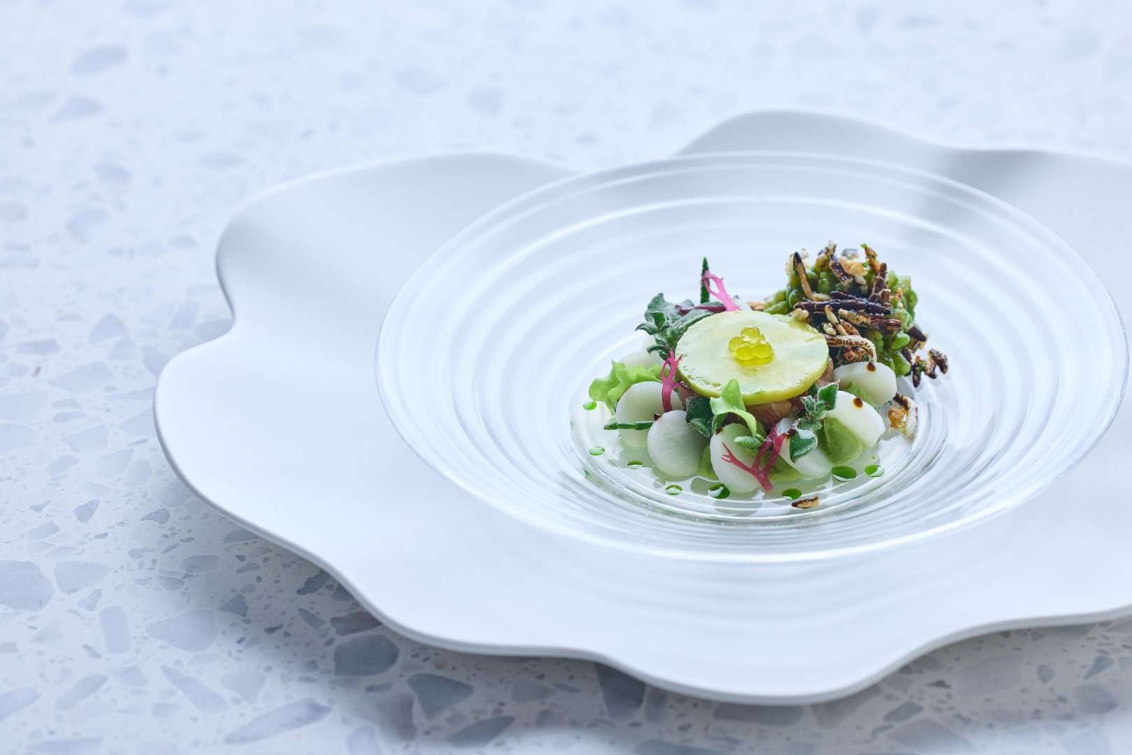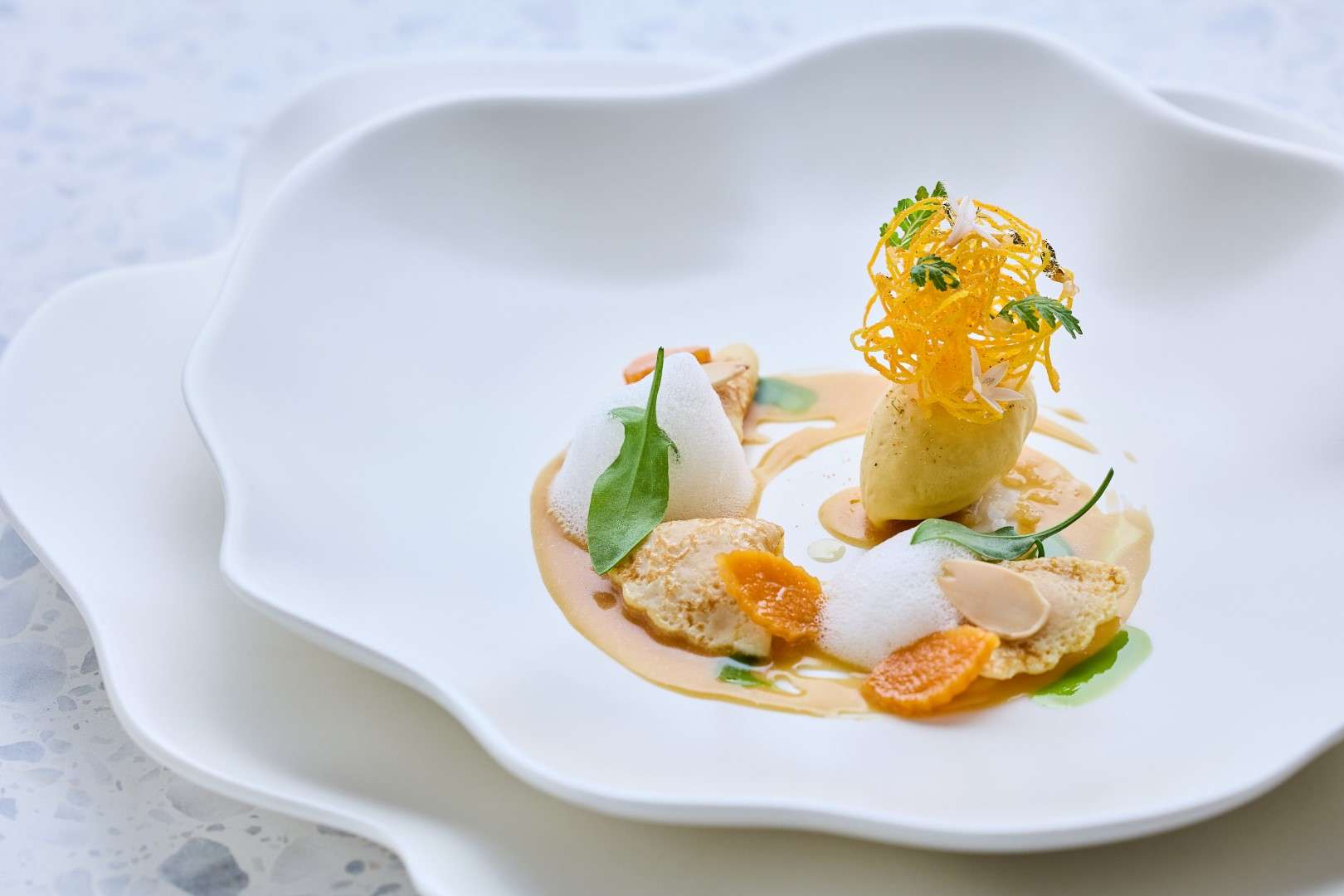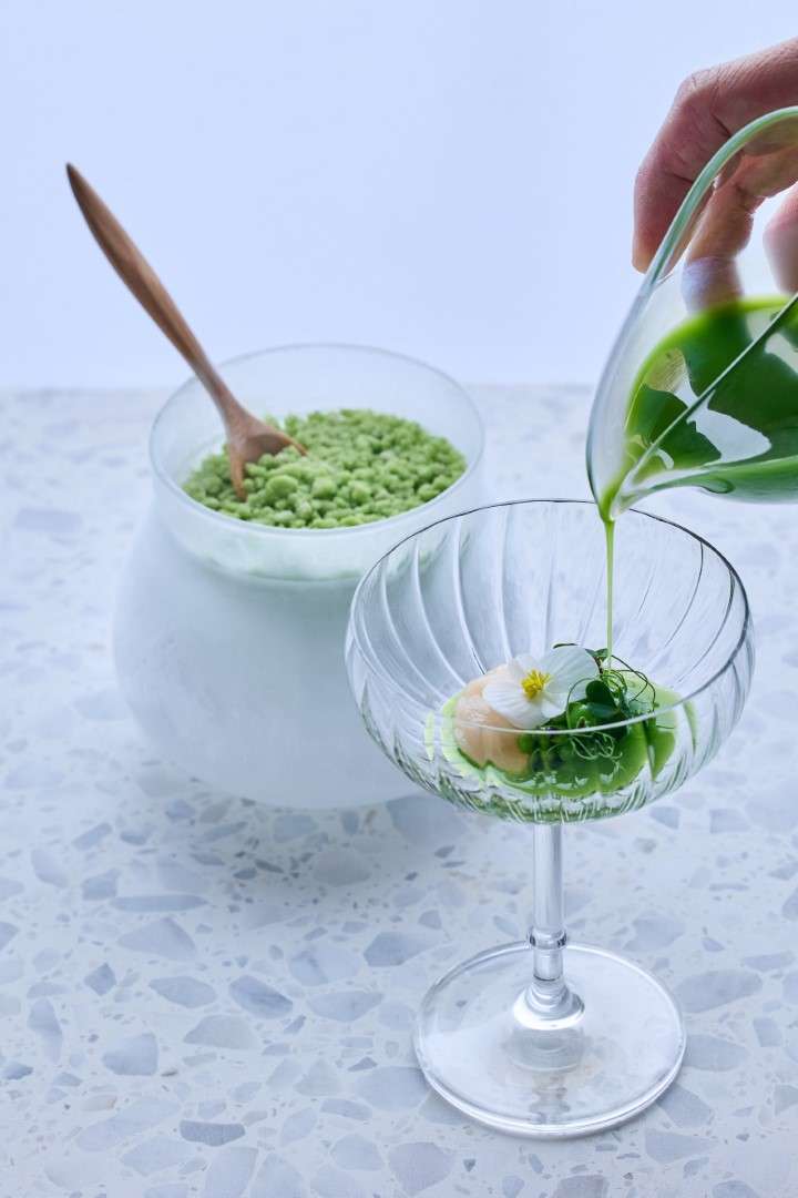 The Technical Pillar: Huang showcases his French mastery through the Petit Pois A La Francaise, a delicate construction of Matsuba crab and teardrop peas, and the Vichy, a vibrant dish of New Zealand King Salmon infused with lavender.