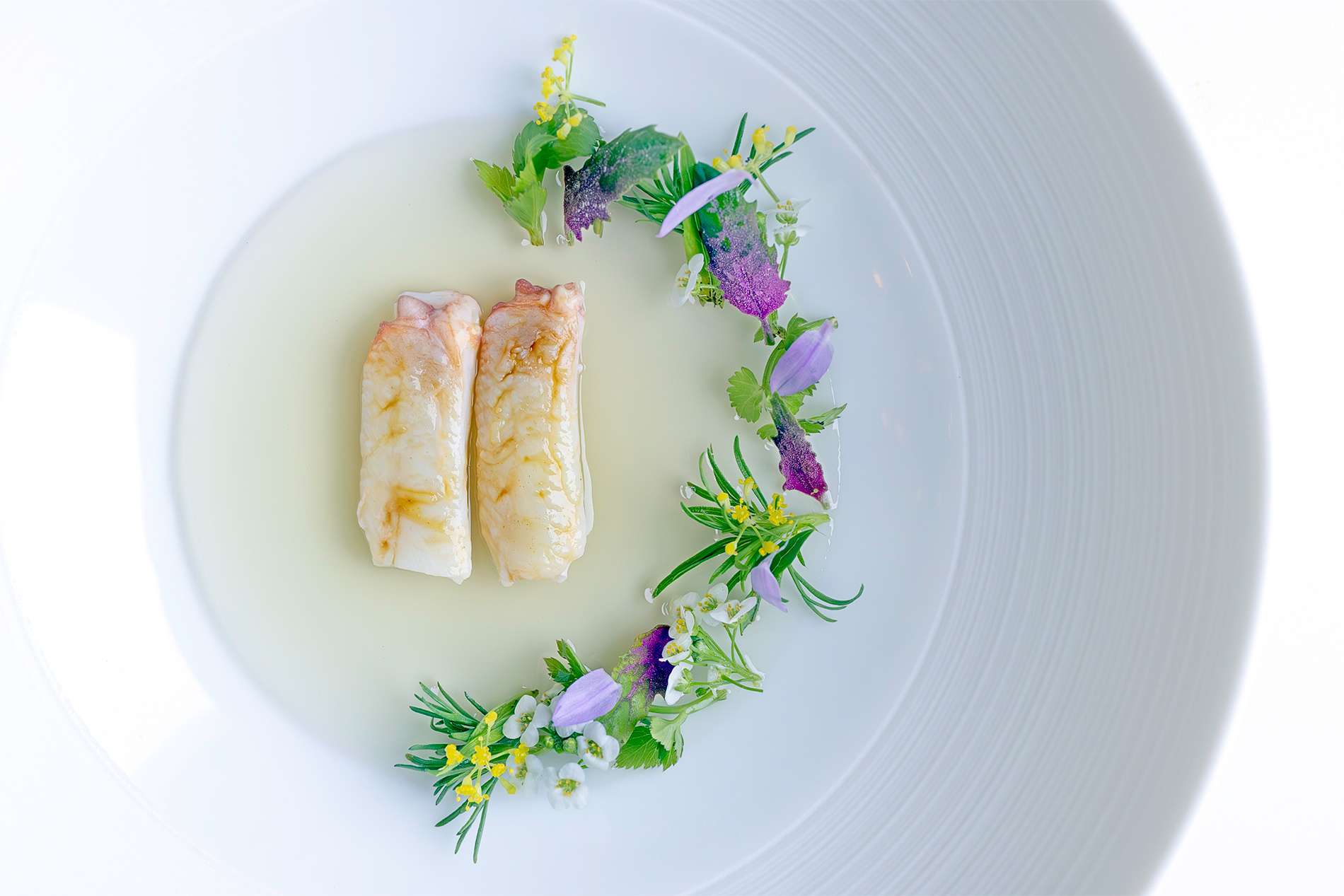 Fish Course: Meunière-cooked brill, hogweed broth — Shellfish from the Breton coast