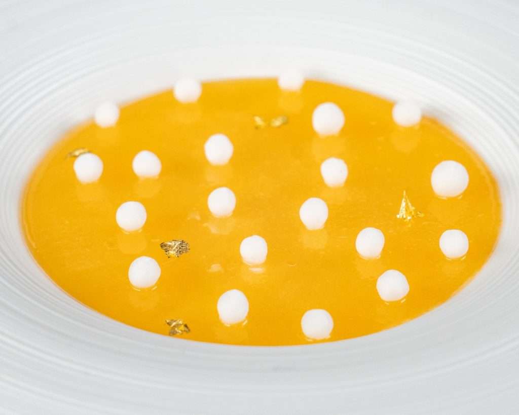 The Umami Bridge: A signature moment of comfort, the Mushroom Cappuccino served with a chestnut doughnut, acts as a sensory bridge between the technical courses and the sweet finale.
