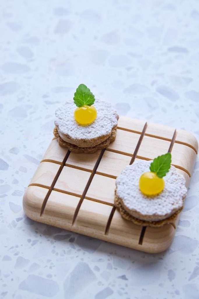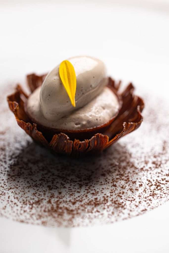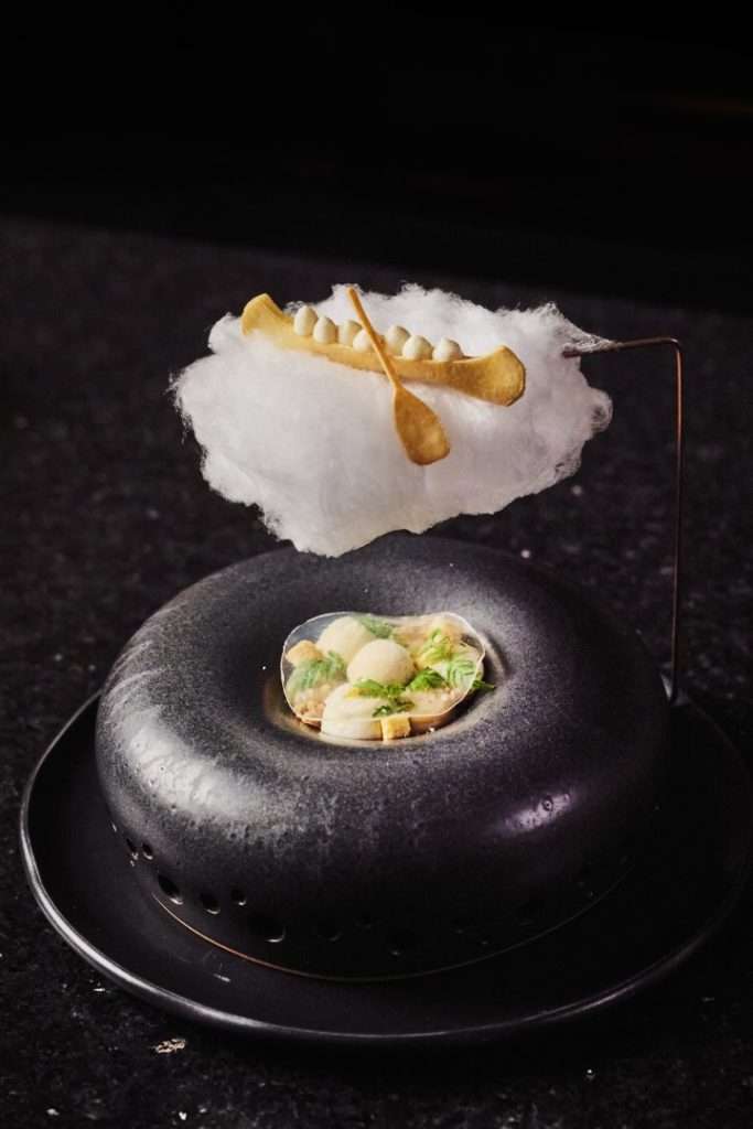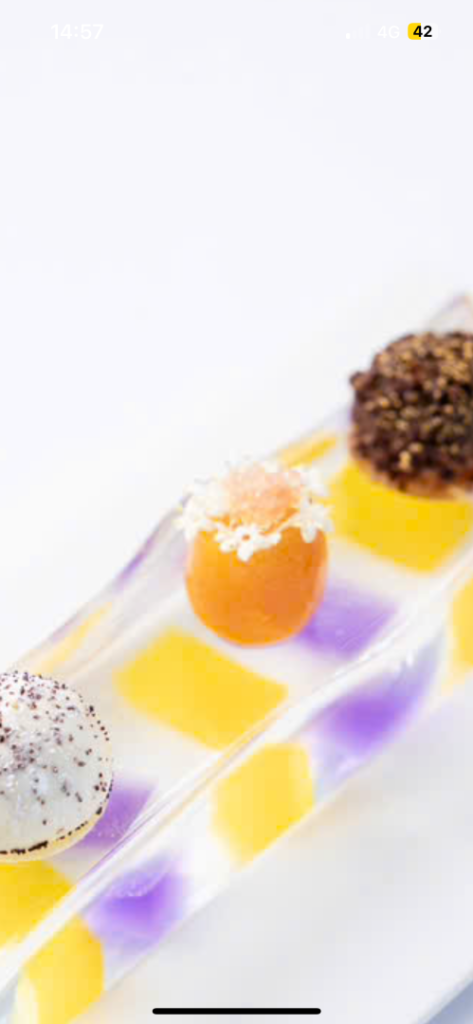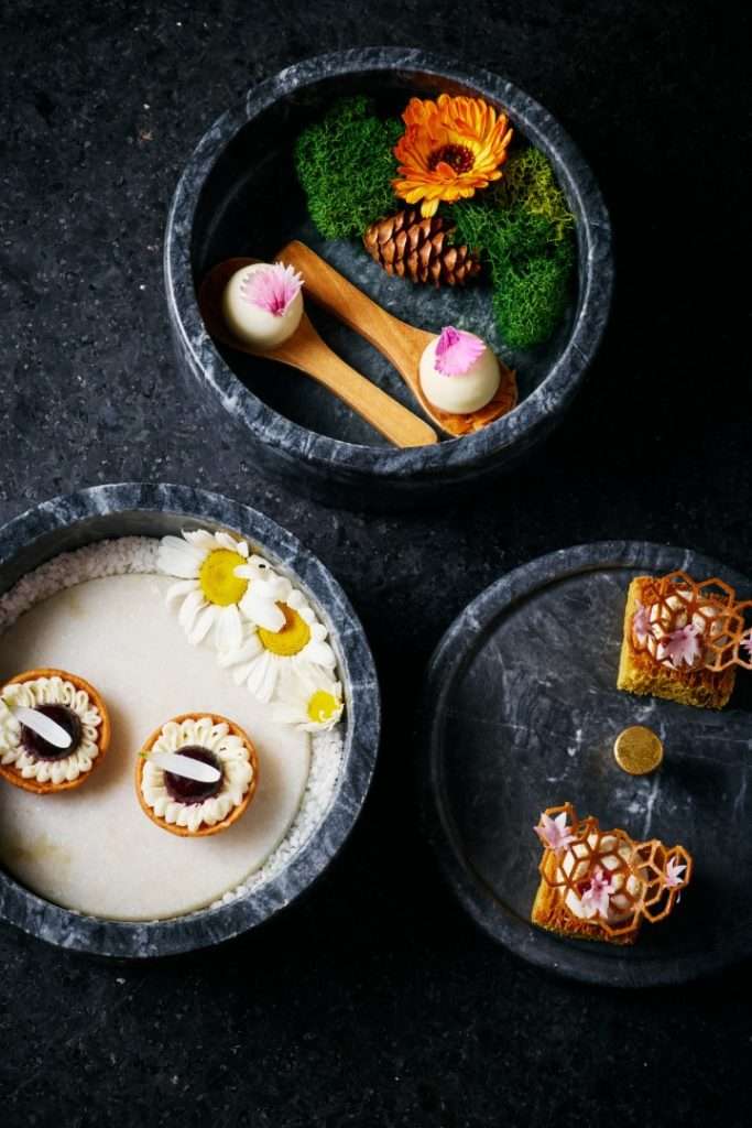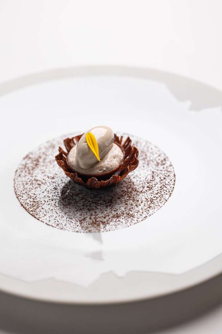 In line with his gallery-inspired setting, Huang’s desserts are visual masterpieces. The S’more reimagines the campfire through burnt marshmallow, truffle, and chocolate, while the Vacherin—a “Root to Flower” creation—blends violet and rhubarb with fermented cream. The experience concludes with a Café Gourmande, featuring Apple Maple Sablé and Cardamon Cannelé, a final bow to the “dynamic continuation” of his art.