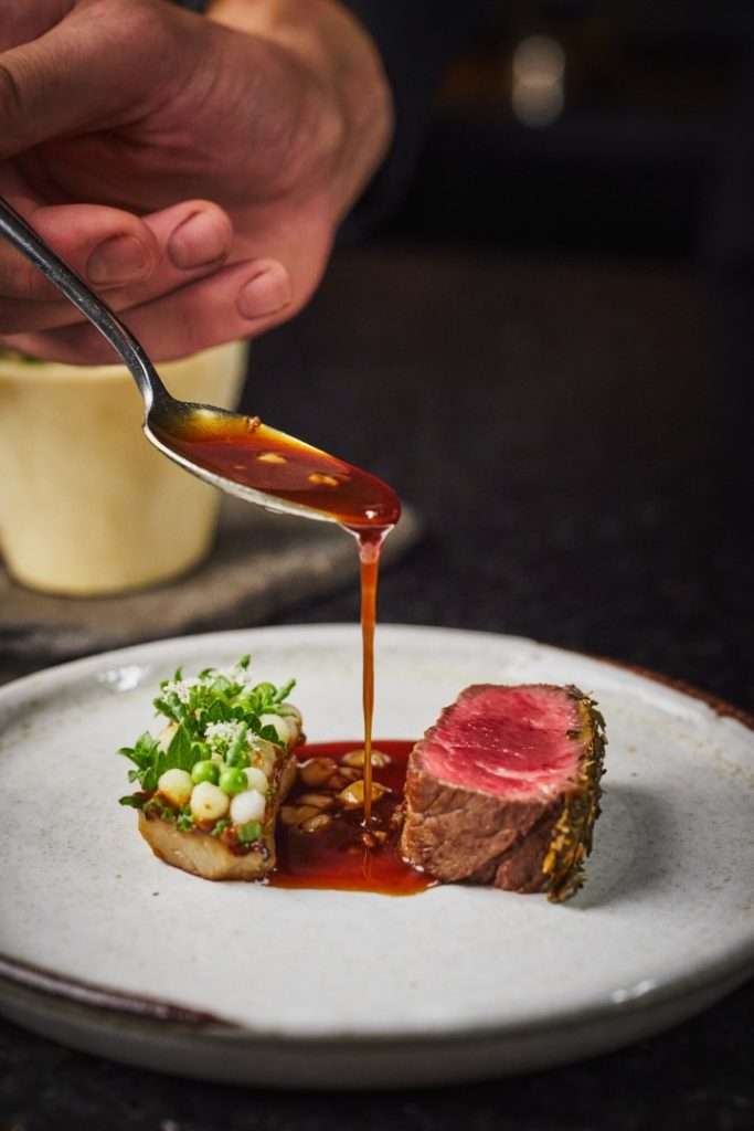 Meat Course: Beef fillet — Foie gras, blueberries, glace, and rose geranium sauce