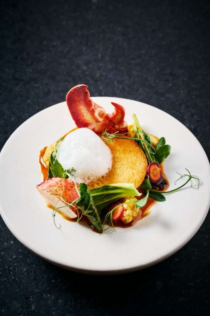 Shellfish Course: Blue lobster on the embers — Carrot, kumquat and curry oil