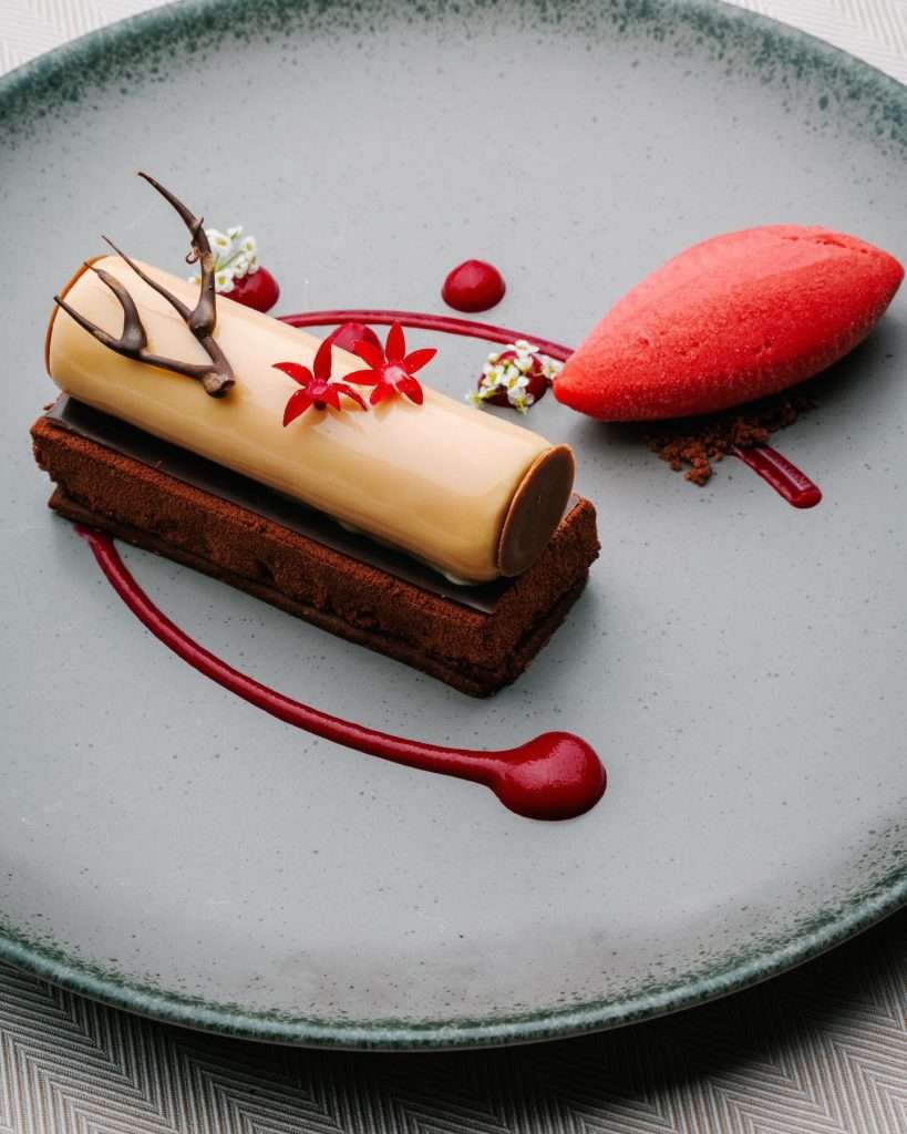 Dessert: Milk chocolate mousse — Bitter chocolate cremeux, beetroot, cocoa biscuit, and blackberry sorbet