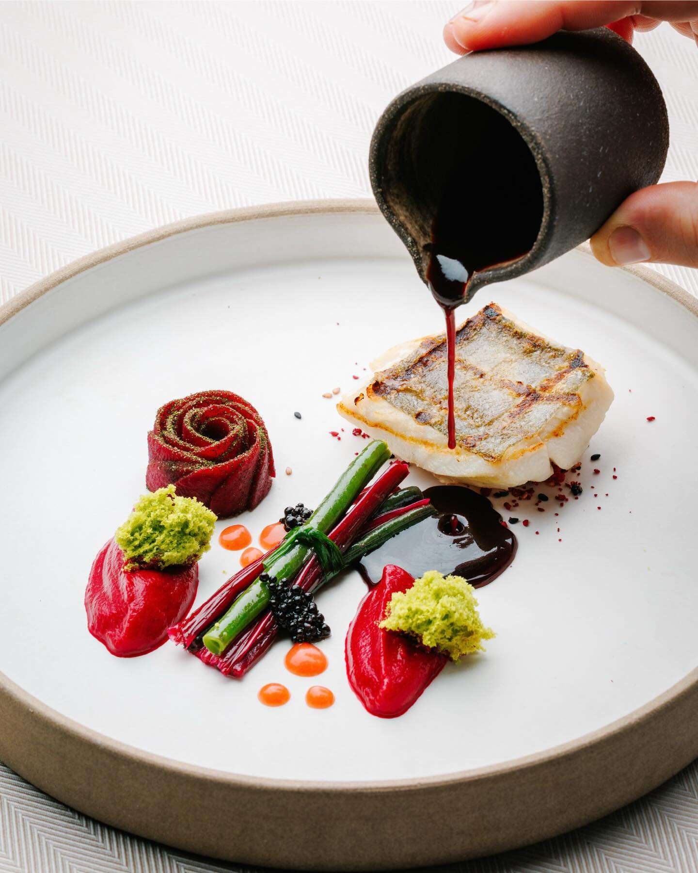 Fish Course: Fish fillet — Beetroot, string beans, raspberries, black garlic, sesame, and Aegina pistachio
