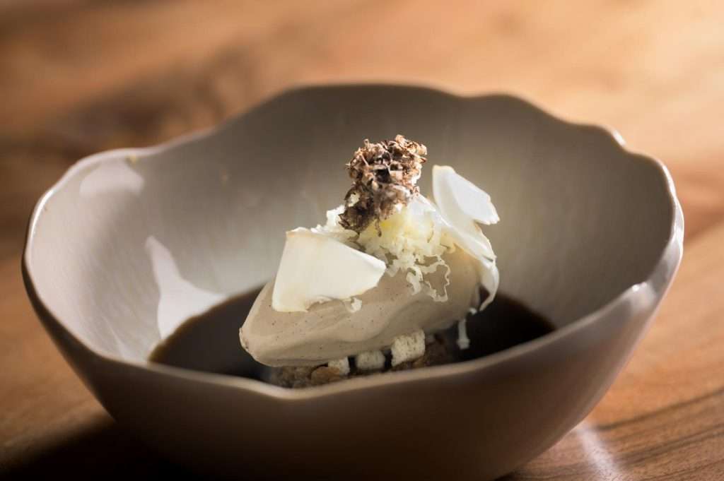 This dish deconstructs the very idea of “mushroom soup,” turning a classic into a multi-textured, temperature-shifting experience. The foundation is a deep, aromatic broth, made from brown mushrooms roasted to an intense color and simmered with dried black mushrooms for a powerful, earthy liquid. At the base of the bowl sits a “jam” of finely minced Paris mushrooms, cooked down into a concentrated duxelle. The dish’s most audacious “twist” is a smooth, cold quenelle of mushroom ice cream. Built on a classic crème anglaise, it’s infused with cooked mushrooms and the unmistakable umami of dried porcini powder. Finished with crunchy croutons, sharp Grazalema cheese, and aromatic truffle, the result is a stunning dialogue of hot and cold, liquid and solid—a truly modern expression of the mushroom.