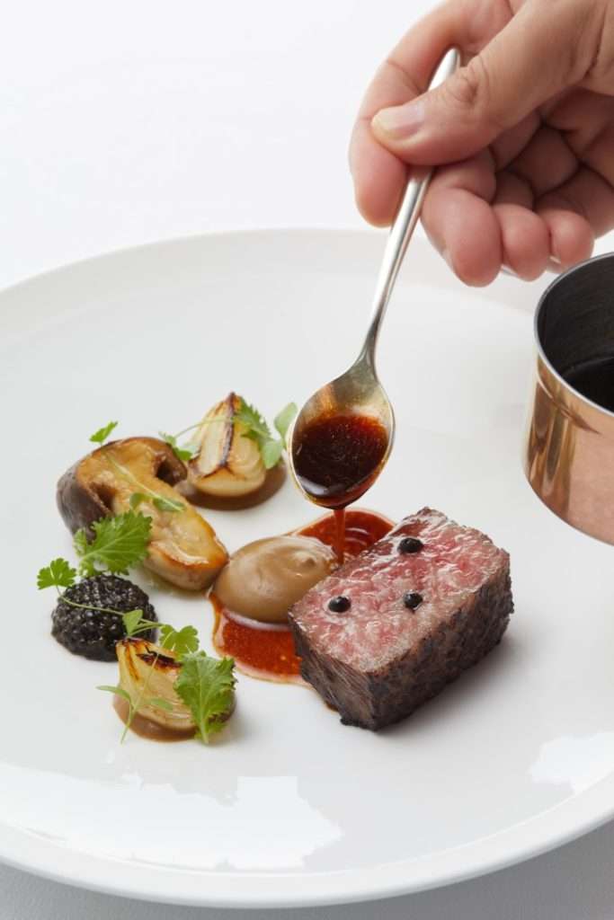 The porcini, or cèpe, is the king of the forest—a mushroom defined by its profound, nutty, and woodland character. In this composition, Chef Kawasaki splits its personality to capture its full essence. First, he coaxes out its deepest soul, slow-cooking both fresh and rehydrated porcini with shallots and white wine. Simmered in stock and finished with cream, the mixture is blended and strained into a silk-like purée—a base of pure, concentrated umami. This earthy foundation becomes the stage for another icon: the legendary Murakami Wagyu A5 beef from his hometown. Prepared with Japanese precision, the beef is marinated, cooked sous-vide to perfect tenderness, and finally ‘kissed’ by the aromatic smoke of binchotan charcoal. The dish is a study in contrasts: the deep, resonant purée and simple roasted porcini halves against the delicate fire of the grill. A finishing touch of house-smoked caviar adds a final, unexpected layer of smoke and brine. It is a precise, harmonious dish that balances Japanese purity with French luxury.
