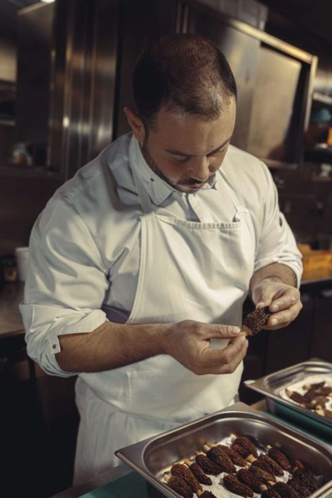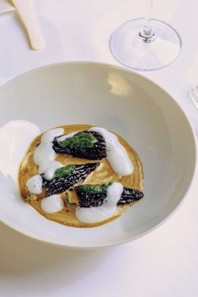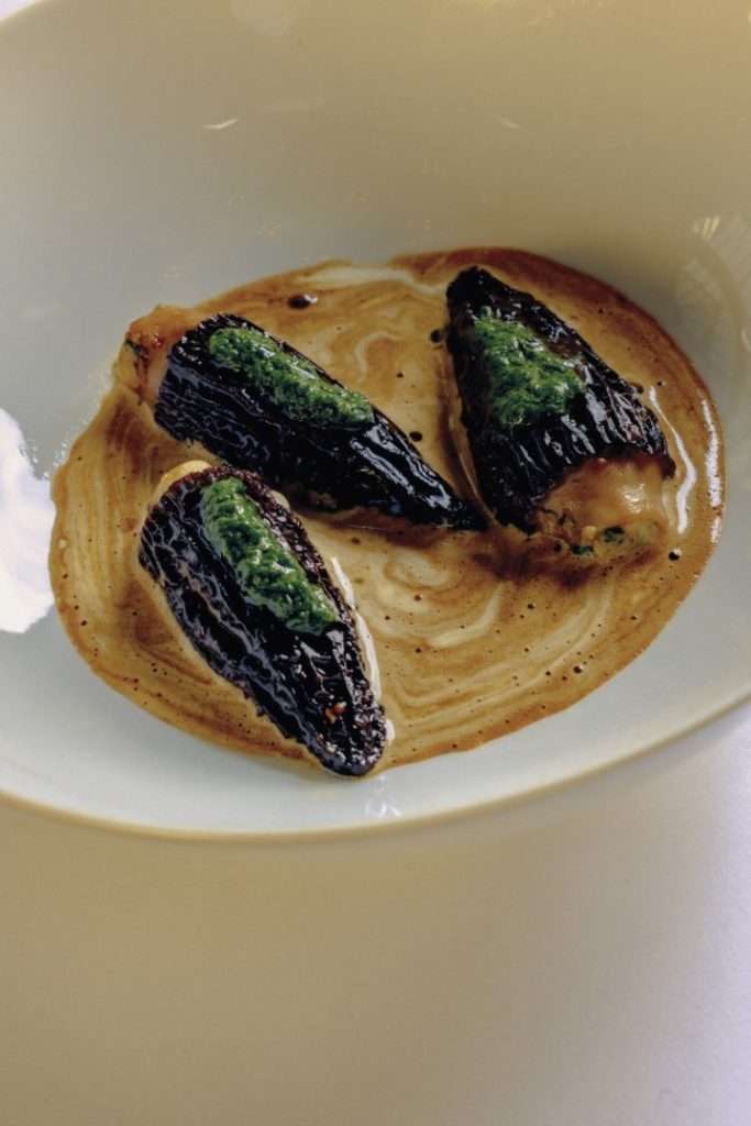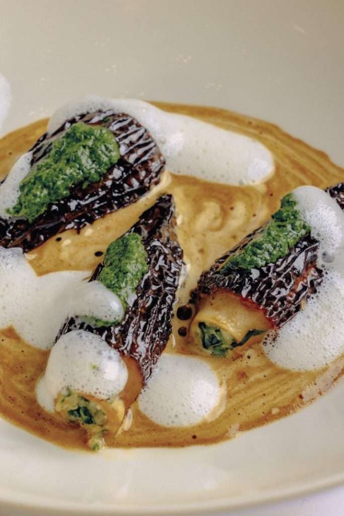 Into this structure he introduces a delicate stuffing — herbs and aromatics chosen not to overwhelm, but to elevate the mushroom’s natural depth. The process demands precision: the blanching must be brief, the stuffing exact, so that the morel remains intact and expressive.