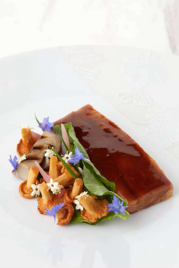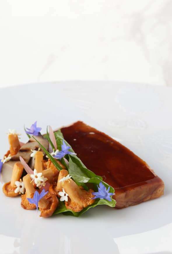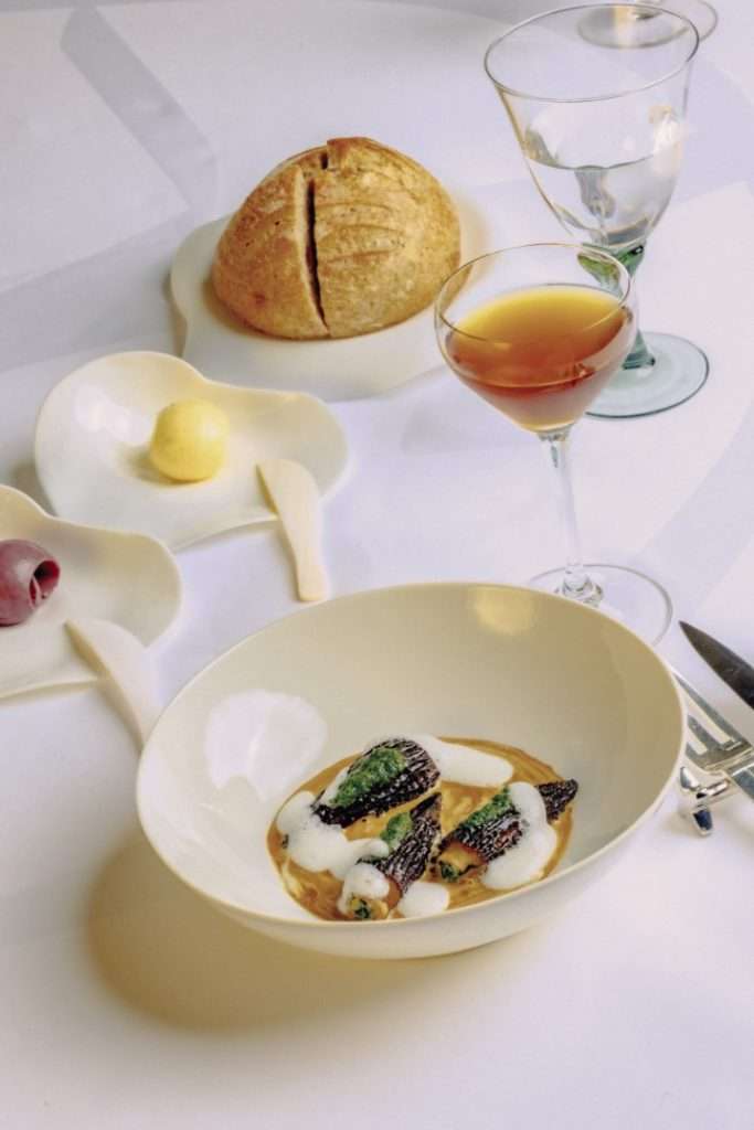 The langoustine tail is perfectly roasted, while its claws are ingeniously transformed with a rich Thermidor-style stuffing. The final touch—and the dish’s most audacious mushroom element—is a light-as-air porcini sabayon. Made by infusing porcini and shiitake, deglazing with Château-Chalon wine, and whisking with egg yolks, it is served from a siphon—a cloud of pure umami that demonstrates Moret’s signature lightness