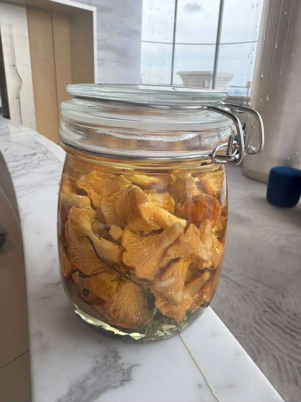To cut this richness, bright, pickled chanterelles are scattered across the top, adding a sharp, acidic counterpoint. The final touch is an ethereal, buttery truffle cream foam, which lends a delicate aroma and a third, airy texture to the plate. The result is a total exploration of the mushroom—from earthy and savory to bright and aromatic—all captured in one modern Italian masterpiece.